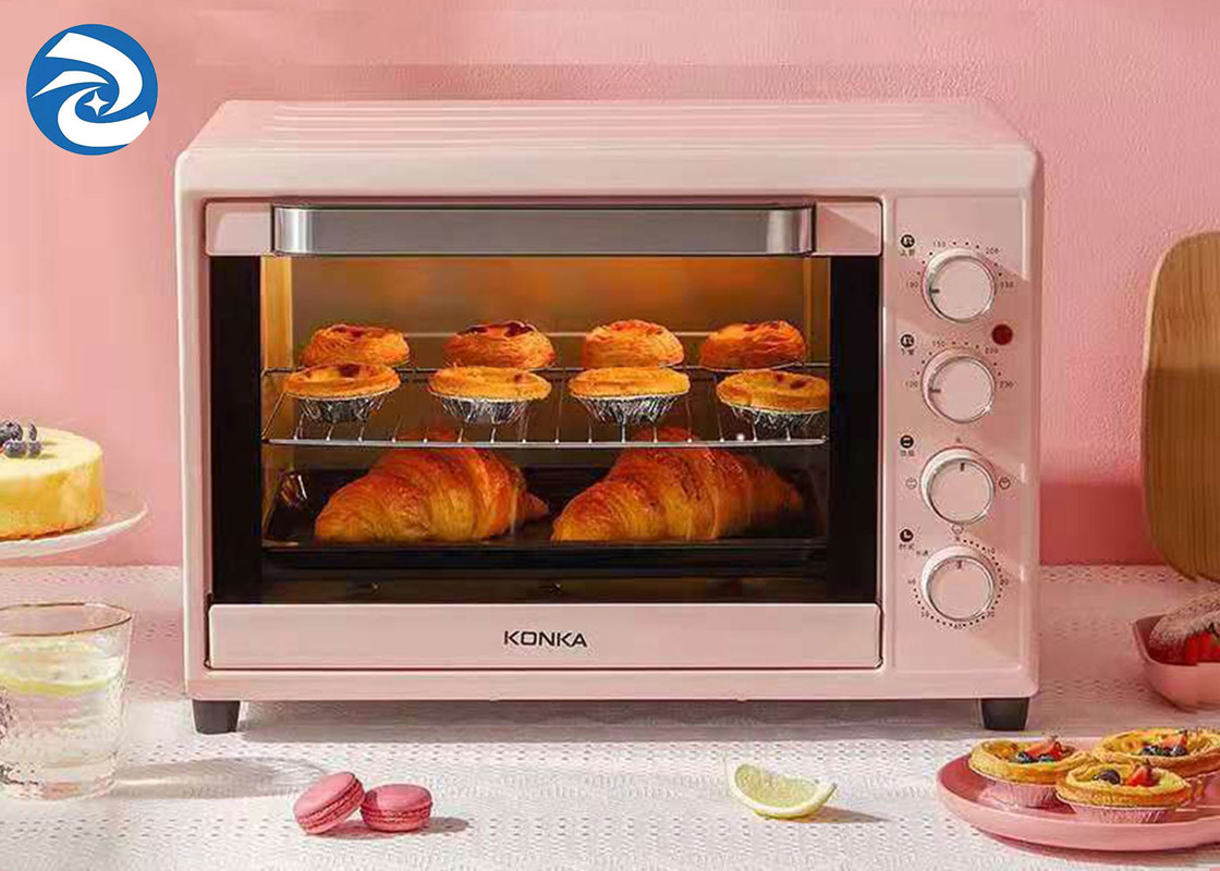 Forno elétrico da multi-função do agregado familiar da grande-capacidade de Konka 42L. Uma máquina sobre oito máquinas, o pão de cozimento, o iogurte caseiro, as refeições de aquecimento, a massa fermentada, as asas de assado, os frutos secos, o bolo de gaze de seda, a galinha inteira de cozimento, e funções múltiplas em um, grande capacidade 42L, quatro botões é de cima para baixo controle de temperatura independente, três-camada grelhando a posição com cozimento na grelha da bandeja grelhando a rede, lâmpada à prova de explosões escondida do fogão.